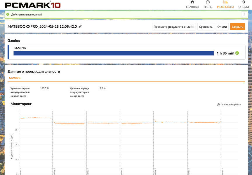 В тесте игровой производительности 3D Mark Time Spy устройство в сумме набирает 4089 баллов. С такими показателями вы на минимальных настройках и в разрешении 1080p сможете запустить тяжелые Cyberpunk 2077 или Grand Theft Auto 5. При этом более современная и требовательная игрушка от польских разработчиков будет идти в 30-40 кадрах секунду и вы периодически будете ловить «просадки», то вот почти десятилетняя «пятёрка» сможет вас обрадовать стабильными и более чем играбельными 60-70 FPS. Соревновательную «Контру» или расслабляющие после трудового дня танчики MateBook X Pro потянет вообще без проблем со значениями «за сотку». Что тут тогда говорить про старые игры или какие-нибудь стратегии (не считая Cities: Skylines 2)?