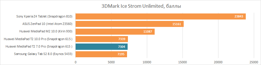 Процессор достался MediaPad T2 7.0 Pro от 10,1-дюймовой модели, поэтому никаких сюрпризов в работе не предвидится. Это доказывают и проведённые тесты — планшеты идут нос к носу. Как и полагается, бюджетной таблетке — бюджетная система-на-кристалле. Мощности Qualcomm Snapdragon 615 MSM8939 со встроенной графикой Adreno 405 хватает на то, чтобы плавно отображать интерфейс оболочки, справляться с казуальными программами, но для игр это модель не подойдёт несмотря на все свои восемь ядер. Объём оперативной памяти составляет 2 ГБ, что в 2016 году уже является отстающим решением. Основная память составляет 16 ГБ, поэтому лучше не разбрасываться ей направо и налево. Всё-таки планшет зачастую является в основном просто устройством для просмотра видео и сериалов, поэтому без microSD не обойтись. Официальный сайт, однако, сообщает, что MediaPad T2 7.0 Pro существует и с 3 ГБ ОЗУ и 32 ГБ на накопителе, но нет данных о том, что его можно будет купить в России.