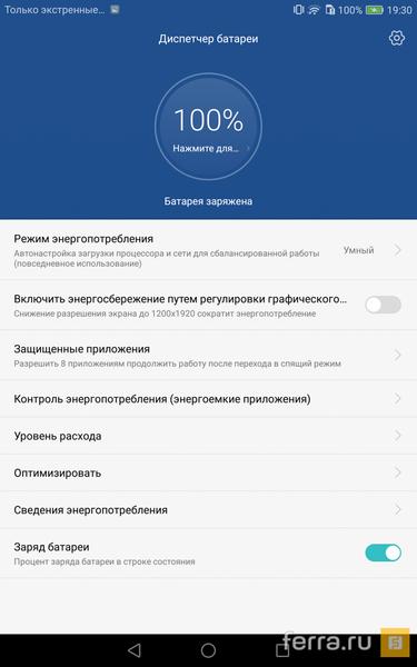 Стандартные планы энергосбережения в оболочке EMUI на месте — при желании можно «затянуть пояса» и заставить планшет протянуть чуть дольше.