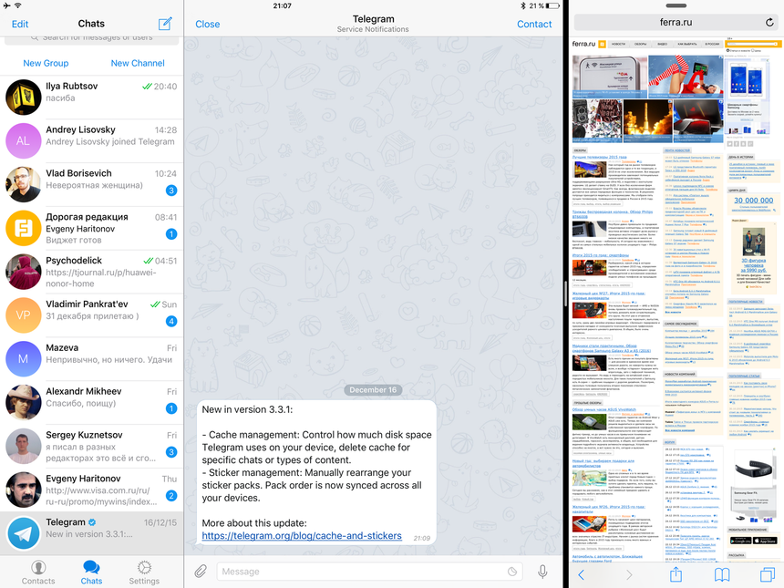 Да, я теперь могу одновременно смотреть на вкладку в браузере и страницу в текстовом редакторе – раньше этого иногда не хватало. Но ни о какой реальной многозадачности (как в OS X) не может быть и речи. Можно отдельно вывести картинку из видеоплеера или Skype/FaceTime поверх экрана, но для всего этот не обязательно иметь iPad Pro – на iPad Air 2 многозадачность работает точно также. Разве что на маленьком экране смысла во всем этом становится еще меньше.