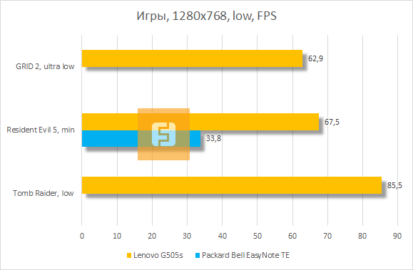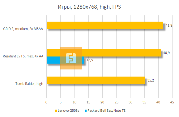 Игровые тесты на сей раз разделены на две группы — по качеству детализации. Со времен тестирования Packard Bell EasyNote ENTE11HC-20204G50Mnks наша методика обновилась, поэтому как таковое сравнение результатов этих двух ноутбуков можно увидеть только в Resident Evil 5 — и в этой старенькой игре производительность лэптопов разнилась почти что троекратно. Что касается остальных двух игр, то в них на Lenovo G505s можно уверенно играть на средних настройках. Но в той же GRID 2 главный герой статьи показывает такое же количество кадров, как Toshiba Satellite P50-A-K9M с высокими настройками и 4-кратным сглаживанием.