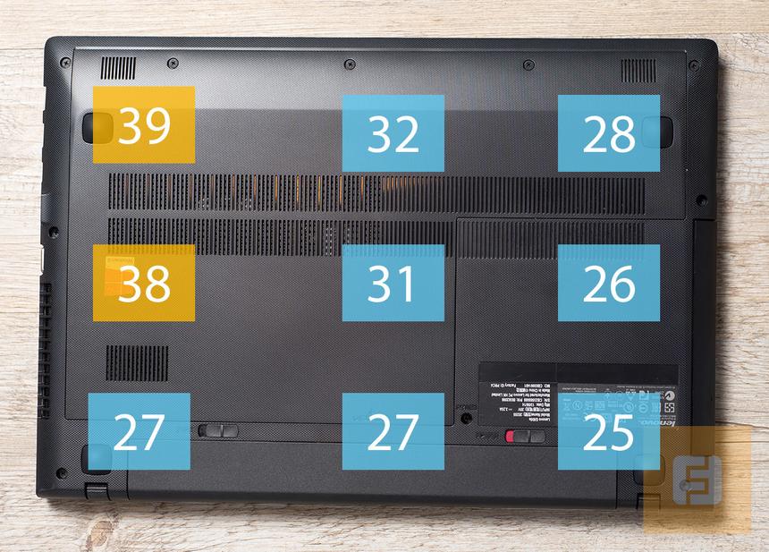 Корпус лэптопа во время часа игры в GRID 2 нагревается лишь местами. Самым горячим участком (как на дне, так и на рабочей панели) становился тот, где сосредоточены оба чипа, ЦП и ГП. Там же установлен и единственный кулер.