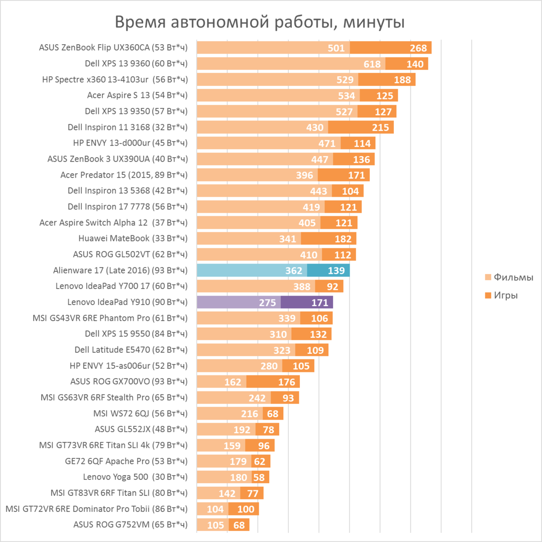 Конечно, время работы в момент, когда лень или нет возможности подключить зарядное устройство, не самый важный фактор для игрового ноутбука. Особенно, учитывая, что играть вдали от розетки вы всё равно вряд ли захотите, так как лаптоп будет экономить заряд за счёт снижения производительности. Однако совсем прикованным к источнику питания себя чувствовать себя тоже не хочется, равно как и носить за собой зарядку по всему дому. И в этом плане лучше обратить внимание на Alienware 17. Он оказался одним из самых долгоигращих геймерских машин из тех, что мы протестировали. Lenovo IdeaPad Y910 от аккумулятора работает заметно меньше.