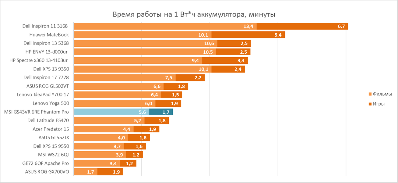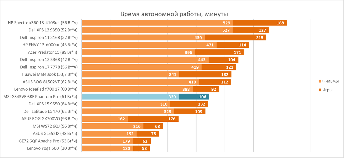 Время автономной работы у новинки не самое впечатляющее несмотря на аккумулятор ёмкостью 61 Вт*ч. Конечно, вы всё еще можете быть удивлены, что на геймерском ноутбуке можно больше 5 часов к ряду смотреть фильмы, что еще лет пять назад было доступно только нетбукам. Однако, что касается конкретно MSI GS43VR 6RE Phantom Pro, в этой дисциплине он проигрывает даже ноутбуку с 17,3-дюймовым экраном.