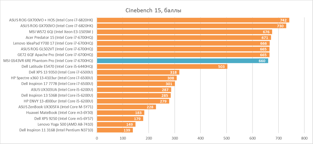 В MSI GS43VR 6RE Phantom Pro установлен очень мощный CPU — Intel Core i7-6700HQ. Такой же можно встретить в большинстве игровых ноутбуков. Кажется, что год от года разнообразие моделей процессоров в ноутбуках всё снижается и снижается и скоро будет только по одному экземпляру для каждой категории ноутбуков: один для игровых, один для ультрабуков, один для планшетов и прочих таких же убогих по производительности гаджетов, и один совсем начального уровня, какой-нибудь Pentium или Celeron. Что, конечно, не умаляет достоинств мощного 45-ватного Intel Core i7-6700HQ, который показывает очень высокую производительность всех своих четырёх ядер и восьми потоков.