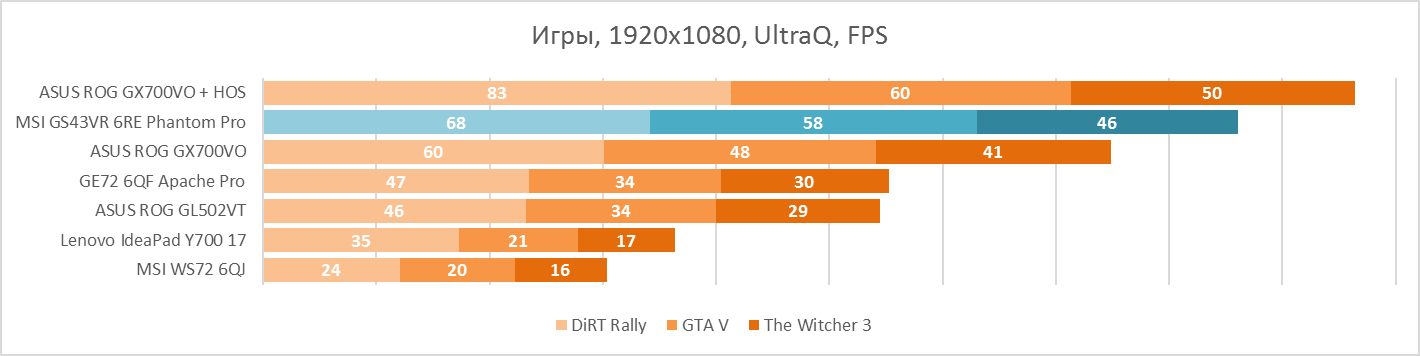 Результат графического бенчмарка 3DMark Skydiver красноречиво показывает, что герой этого обзора с GTX 1060 опережает ASUS ROG GL502VT с таким же процессором, но видеокартой GTX 970M, примерно на 19%. А что же в играх? Тут не всё-так однозначно. К примеру, в Dirt Rally на средних настройках качества графики «фантом» выдаёт меньше FPS, чем его противник со «старой» видеокартой. Почему? Банально потому, что процессор у MSI GS43VR 6RE Phantom Pro перегревается, пропускает такты и сбрасывает частоты, а Dirt Rally очень чувствителен как раз к производительности CPU. В двух оставшихся играх, наоборот, виден очень серьёзный прирост количество кадров в секунду — после этого всем владельцем лэптопов с 970M захочется молча выкинуть их в окошко.
