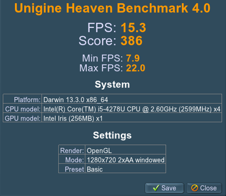 Apple давно убеждает нас в том, что MacBook Pro — это не только рабочая станция, но и вполне себе игровой ноутбук. И в самом деле, игр для Mac становится все больше, однако мы бы не стали рекомендовать Mac в целом и MacBook Pro с Retina-дисплеем в частности любителям игр. Для этого есть более производительные решения. Ну а для иллюстрации того, что играть на MacBook Pro в целом можно, мы провели тестирование с помощью Unigine Heaven. Результаты вы можете видеть выше.