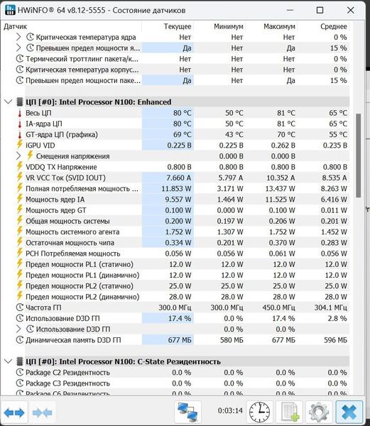 Причём среди всех устройств на Intel N100 этот планшет один из самых быстрых. Не зря в нём прилепили охлаждение вентилятором! Планшет, во-первых, не перегревается никогда и ни при каких условиях. А во-вторых, что даже важнее, работает при 12 Вт TDP в долгосрочной (PL1) нагрузке. Это весьма круто — в планшетах могло быть и гораздо хуже.