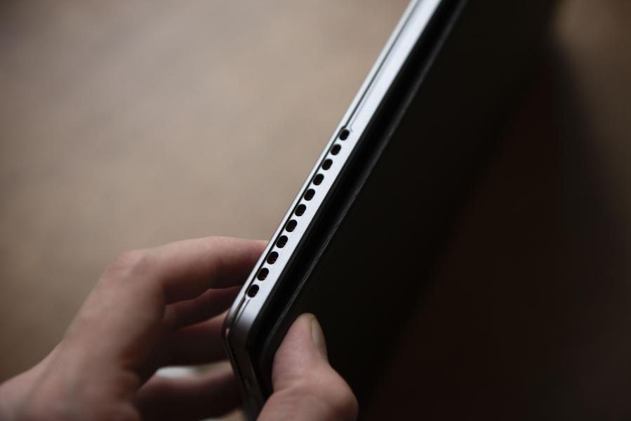 На левой грани разместились классические «планшетные» клавиши: качелька регулировки громкости и кнопка разблокировки и включения девайса. Про вентиляцию тут тоже не забыли и впихнули вспомогательные отверстия для воздуха (и динамиков, их тут четыре) на три из четырёх сторон.