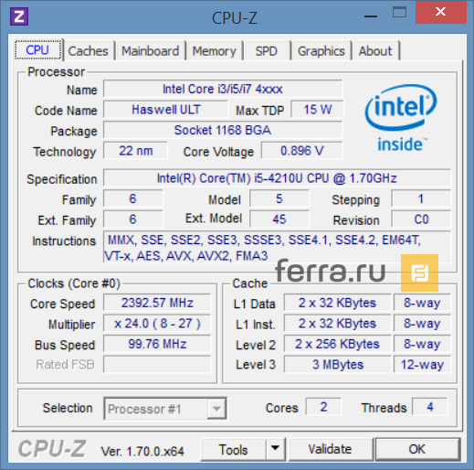 | Процессор | Intel Core i5-4210U (2 ядра/4 потока, 1,7/2,7 ГГц, 15 Вт) |