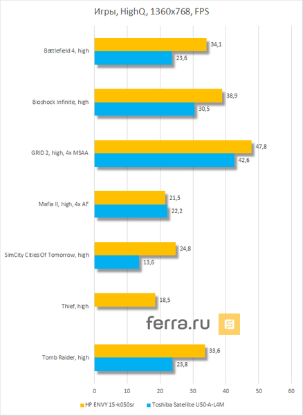 Наконец, игры. Тут разница между железом двух ноутбуков раскрывается во всей красе. HP ENVY 15-k050sr показывает на 46% большее количество кадров в секунду при низких настройках графики, и на 34% — на высоких. Но речь идёт о среднем проценте, а не о каждой отдельно взятой игре. Так, максимальная разница в пользу главной героя обзора составляет 86% в SimCity на низких настройках, а в самом худшем случае он даже уступил 3 процента Satellite U50-A-L4M в Mafia II.