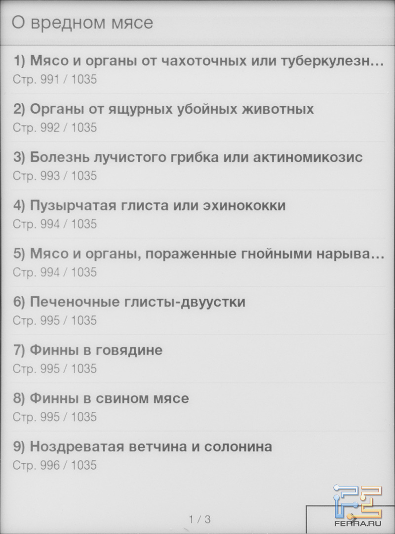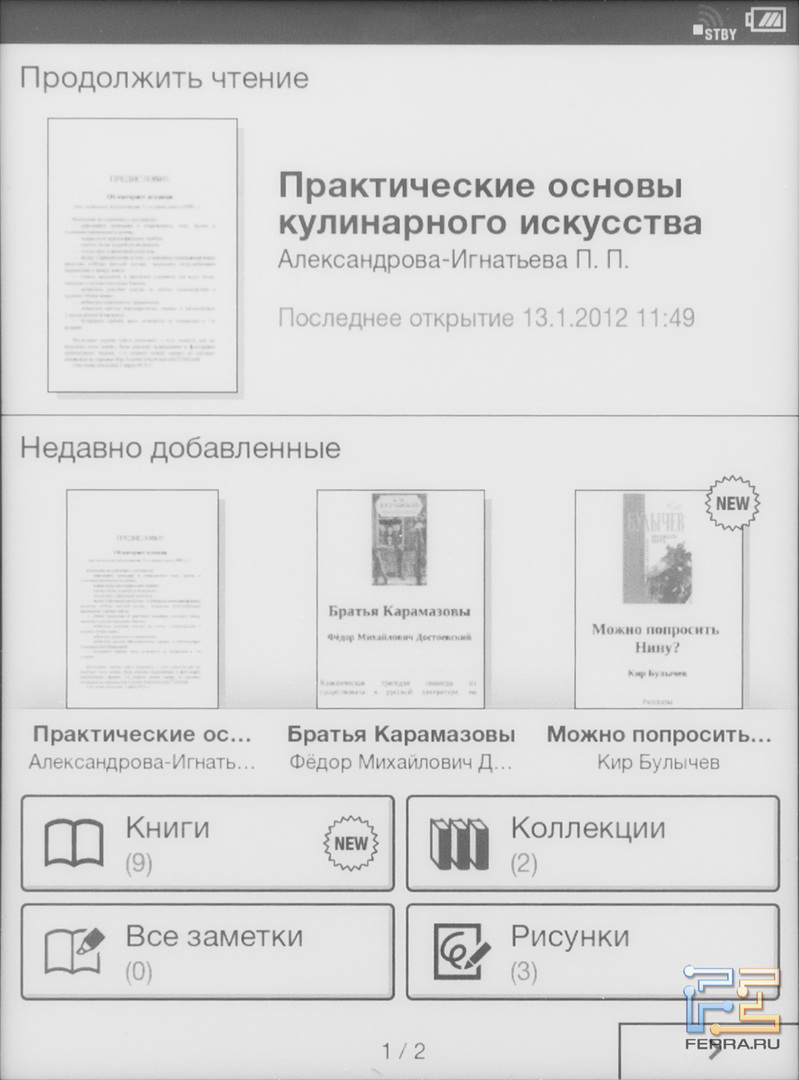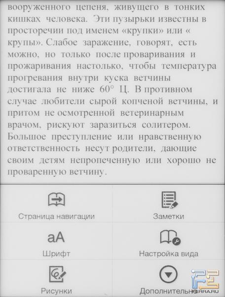 Книги всех трёх форматов открываются быстро и корректно, перелистывание страниц занимает доли секунды. Прямо в режиме чтения можно подобрать подходящий размер шрифта, не бегая в меню настроек. Поддерживаются оглавления и сноски. С кириллицей проблем нет, ридер умеет использовать шрифты, записанные в файлах с книгами, а если они отсутствуют – использует собственные.