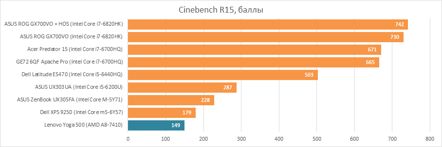 Как я уже упоминал, одна из модификаций Lenovo Yoga 500 оснащена не одним из «низковольтников» Intel, а APU от AMD последнего поколения — Carrizo-L. Процессор AMD A8-7410 является топовым в серии Carrizo-L, имеет четыре ядра, работающих на частоте до 2500 МГц, встроенную графику AMD Radeon R5. При этом TDP может варьироваться от 12 до 25 Вт в зависимости от того, на что захочет сделать упор производитель лэптопа — на производительность или на время автономной работы и минимальный шум от системы охлаждения. Судя по заявленному тепловыделению, новые чипы могли бы побороться с процессорами Intel Skylake, но при производстве последних используется 14-нм техпроцесс, а AMD всё еще применяет 28-нм. Запустим тесты и посмотрим, какое место AMD A8-7410 займёт среди того, что сейчас на рынке может предложить Intel.