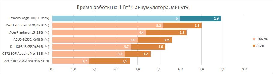 В тесте автономной работы процессор AMD A8-7410 показал себя наилучшим образом, а вот ноутбук Lenovo Yoga 500 — нет. Другими словами, производитель лэптопа оснастил его очень маленьким по ёмкости аккумулятором, всего 30 Вт*ч. Поэтому, хоть на каждый Вт*ч ноутбук способен «крутить» HD-фильм целых шесть минут, но проку от этого мало. Три часа работы для устройства с экономичным процессором, да еще трансформера, это весьма постыдный результат. Но виноват здесь не AMD A8-7410, а маленькая батарея.