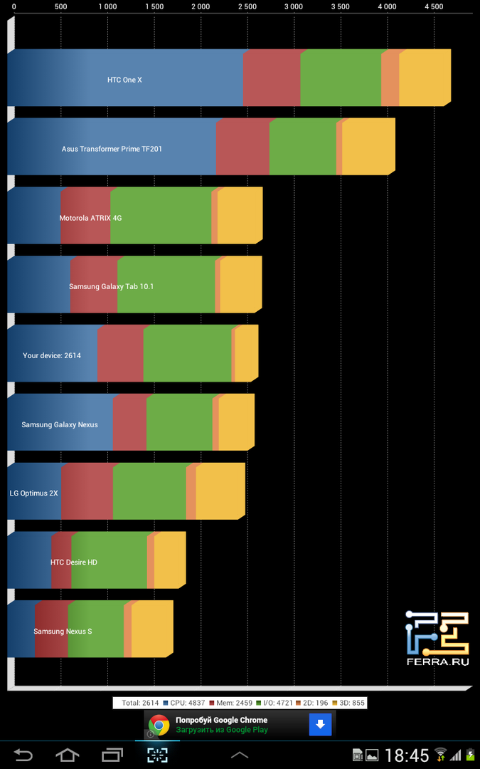 Железная начинка достаточно мощная по нынешним меркам: двухъядерный гигагерцевый процессор, гигабайт оперативной памяти, а вот флеша не очень много – 16 гигабайт. Причём в других странах продаются и модификации с хранилищем вместительнее, а нас почему-то обидели. К счастью, имеется слот для microSD. Плавность работы интерфейса налицо, «тяжелые» игры работают довольно шустро, большое количество запущенных приложений не тормозит систему. Традиционно приведем скриншоты бенчмарков и обратим ваше внимание на то, что в «попугаях» первый Tab оказывается даже слегка производительнее, хотя наследник не так уж сильно отстаёт.