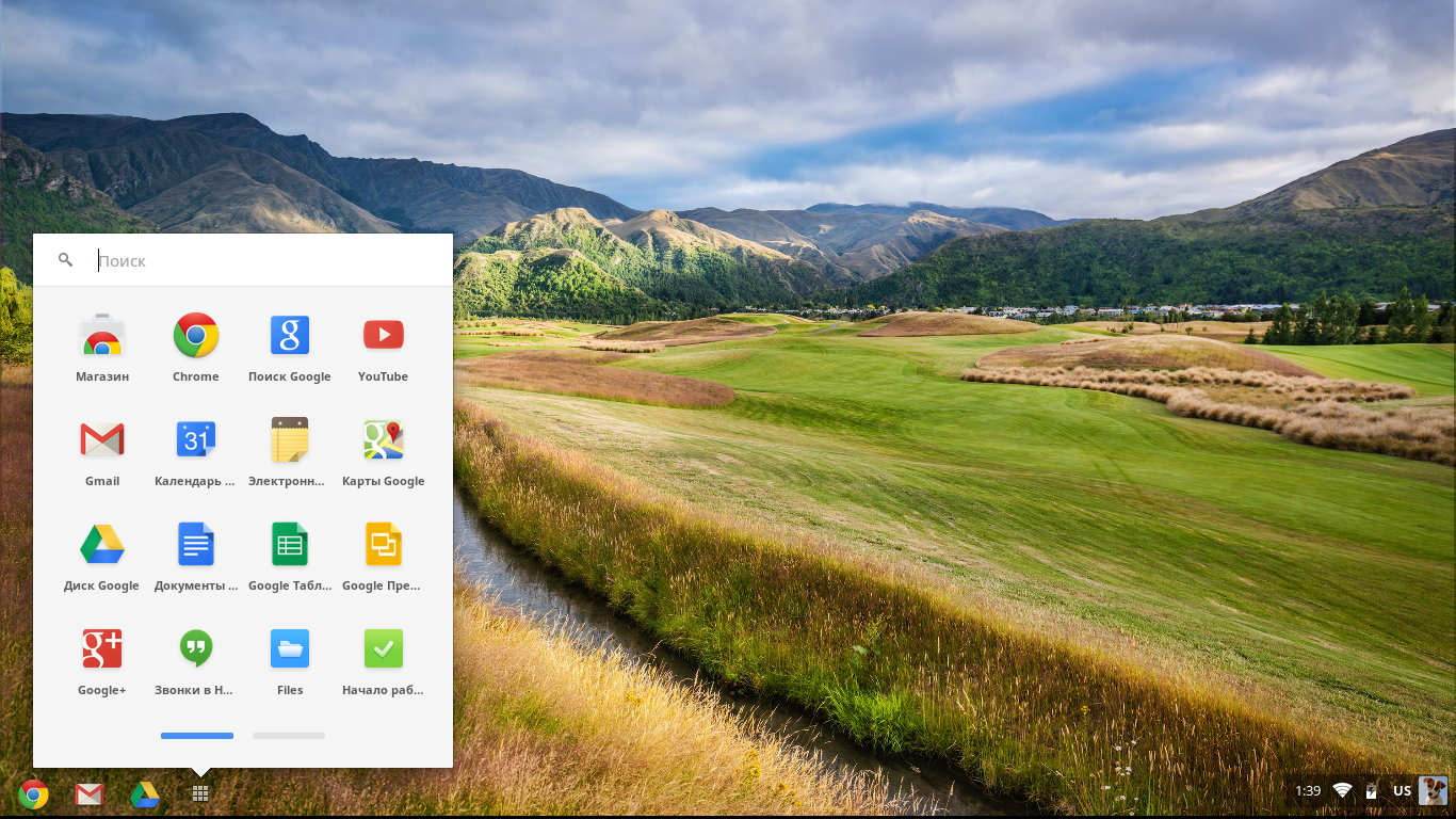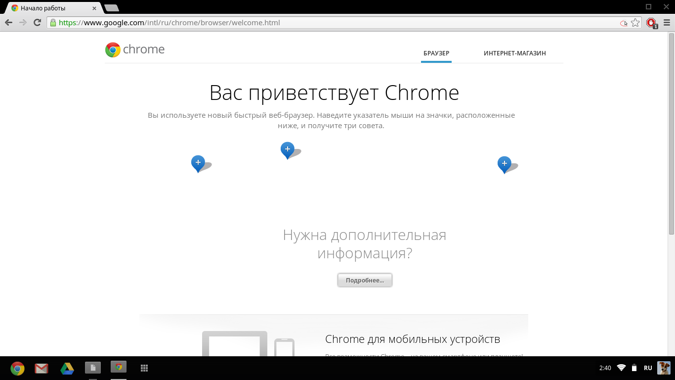 Вообще, браузер — центр вселенной для хромбука. Он является интерфейсом для настроек и рабочей средой для 99% программ. В ранних версиях ОС Google предлагала отказаться от интерфейса вне браузера вообще, но последние версии Chrome OS стали гораздо толерантнее к Windows и MacOS-пользователям, что, несомненно, плюс. Появилась панель быстрого запуска и панель настройки, однако на самом рабочем столе ярлыки размещать нельзя. В изначальной конфигурации отдельными приложениями является только калькулятор, камера, файловый менеджер, заметки и клиент Google Hangouts. Все остальные ярлыки представляют собой банальные гиперссылки, открывающиеся в браузере Chrome. Воспользоваться Google Диском или Gmail вы уже можете оффлайн — изменения будут внесены сразу же после подключения к сети. Доступен также и гостевой режим со стандартными настройками ОС и закрытым доступом к файлам. После выхода из него все произведенные изменения будут стерты — похожий сценарий работы на десктопном браузере Chrome окрестили приватным окном.
