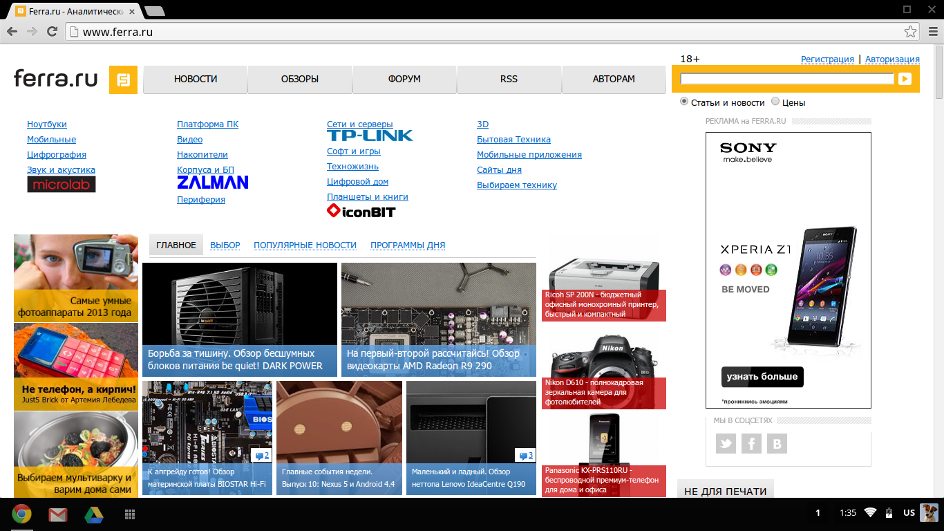 Однако синтетика синтетикой, а кривые перегруженные рекламой сайты никто не отменял. Нетбучная скорость работы в десктопной реализации браузера особого воодушевления не вызывает. Да, интерфейс на «чистом» Google Chrome работает отлично, а парсинг страниц проходит безболезненно. Но для серьёзной работы Chromebook не создан. Когда количество вкладок превышает 10 штук, процессор просит пощады, и Chrome OS норовит «заморозить» неактивные вкладки до востребования, перезагружая их, как только они будут запрошены пользователем. На медленном соединении это своенравие приводит к разительному увеличению расхода траффика, а на быстром соединении вы будете вынуждены следить за постоянно уходящей в «сон» вкладкой потоковой музыки или вообще работать в тишине. О трудностях работы с браузером Chrome, «нафаршированным» расширениями под настольный ПК, лучше вообще умолчать. Энтузиастам предстоит процедура неприятной экономии — ведь все расширения неминуемо подтянутся с настольного ПК и катастрофически затормозят вроде бы шустрый поначалу хромбук.