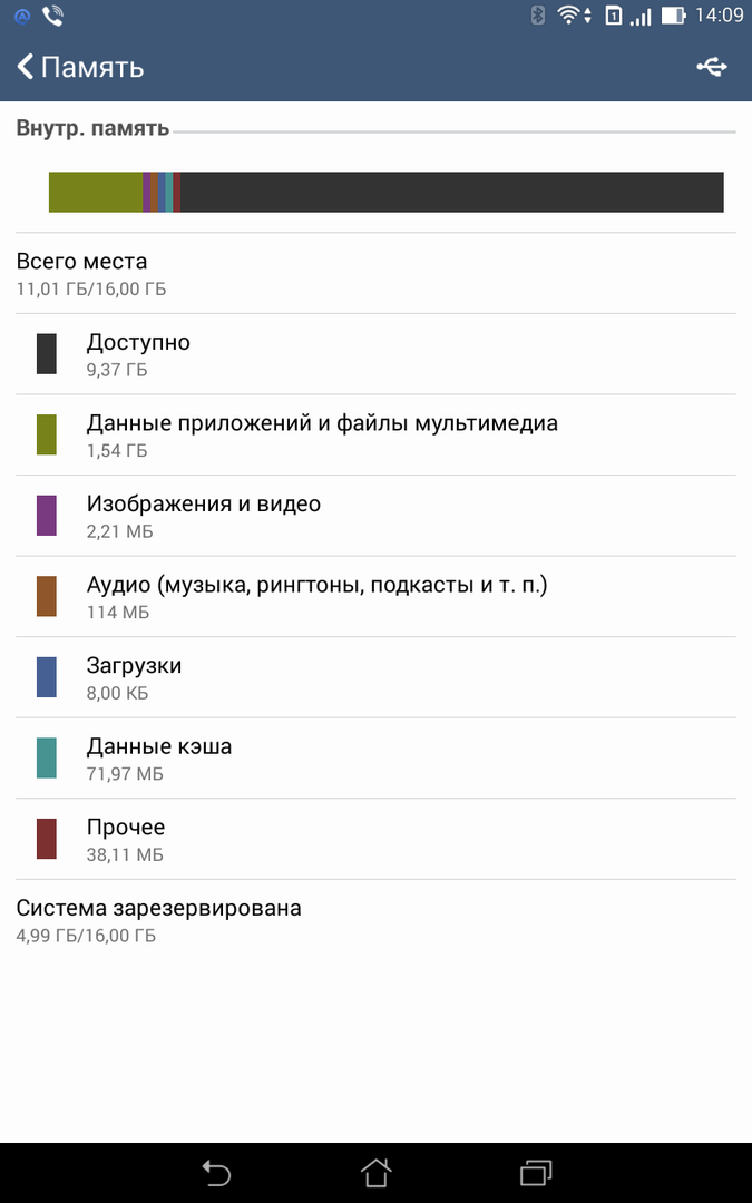 В планшете имеется 16 Гбайт постоянной памяти, но всего 1 Гбайт оперативной. Получается некоторый дисбаланс — мощная система-на-чипе, но регулярная нехватка «оперативки». А вот постоянной памяти в самый раз, к тому же её можно расширить за счёт карт microSD объёмом вплоть до 64 Гбайт.