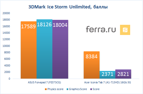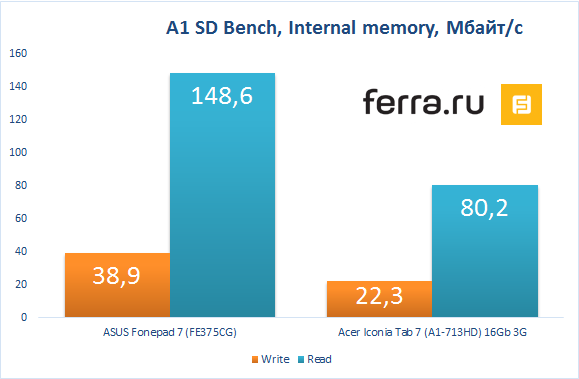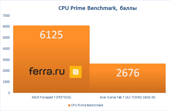 Обратимся к бенчмаркам. Я собрал результаты ASUS Fonepad 7 (FE375CG) в графики, сравних их с результатами Acer Iconia Tab 7 (A1-713HD) — 7-дюймовым планшетом за 7 тысяч рублей. Подробнее вы можете узнать о нём в нашем обзоре.