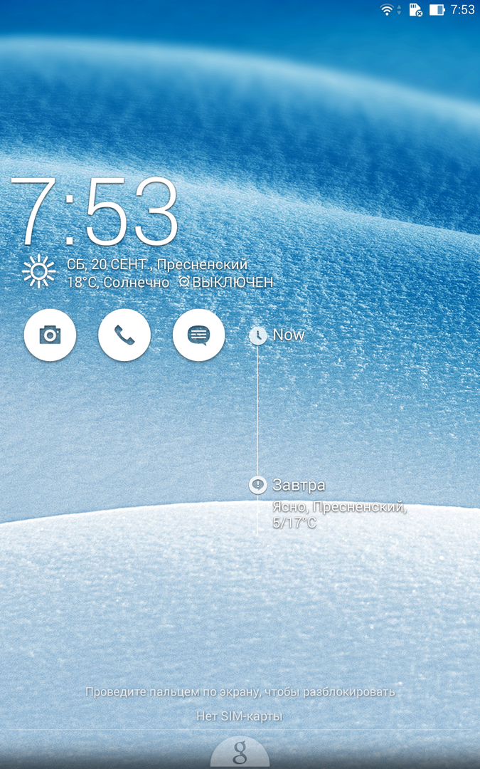 Экран блокировки предоставляет доступ сразу к камере, звонкам и сообщениям, сюда же выводятся сведения о погоде для вашей локации. Кстати, о погоде — планшет вас обязательно предупредит вечером о том, что завтра будет дождь. Это очень мило. И полезно для таких как я, кто всё время забывает посмотреть прогноз погоды.