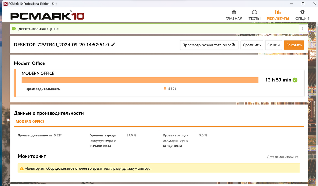 А в дешёвых ноутбуках просто НИКТО не ставит 75 Вт*ч в 14-дюймовый корпус. Короче, при яркости в 200 нит (70% от максимальной) ноутбук работает что в Chrome + Microsoft Office, что при просмотре видео примерно 12-14 часов. Это обадлеть как долго и круто. И даже на 100% яркости, а она тут 350 нит, ноут проработает 9 – 9.5 часов. Ради этого можно простить ему его чуть больший, чем принято для ноутов такой размерности, вес — он реально с утра до ночи протянет и не разрядится в ноль.