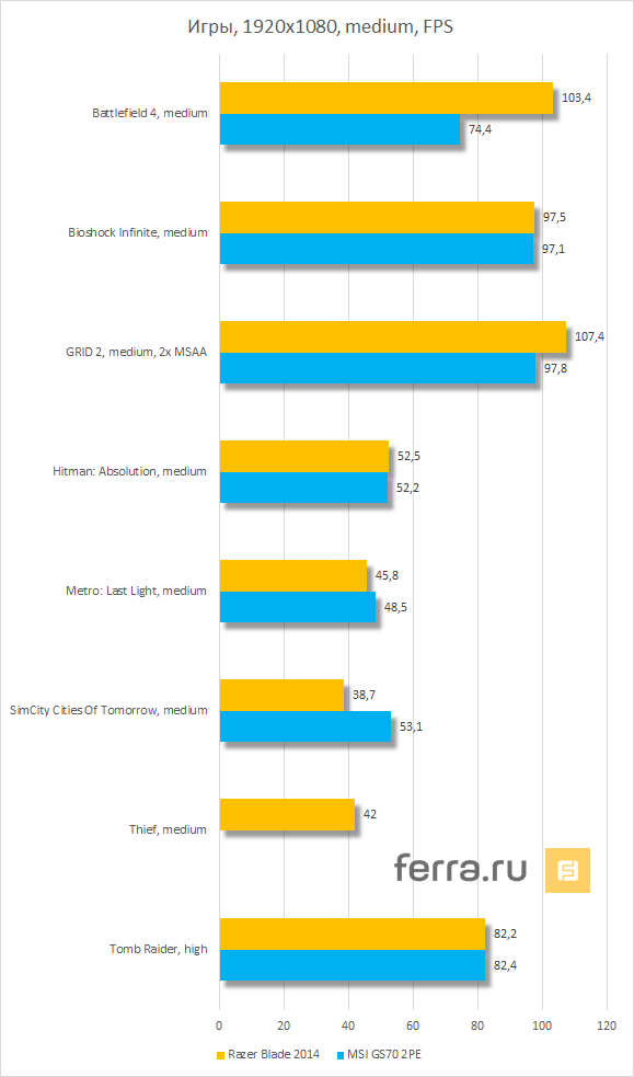 Подвести итог оказывается тяжело, так как на почти одинаковых системах игры порой вели себя совершенно по-разному. К примеру, в зависимости от уровня настроек графики, SImCity на Razer Blade показывала на 20-27% более скромное число кадров в секунду. А Battlefied 4, наоборот, на герое этого обзора запускался с FPS, возросшим в среднем в полтора раза — от 39% на средних настройках до 61% на высоких. Также на высоких настройках лучше вели себя на Razer Blade Bioshoсk и Metro. Возможно дело в новых графических драйверах, а возможно и в том, что более горячий Intel Core i7-4700HQ в MSI GS70 2PE временами сбрасывал тактовую частоту из-за перегрева, а за Razer Blade такого замечено не было.