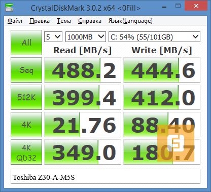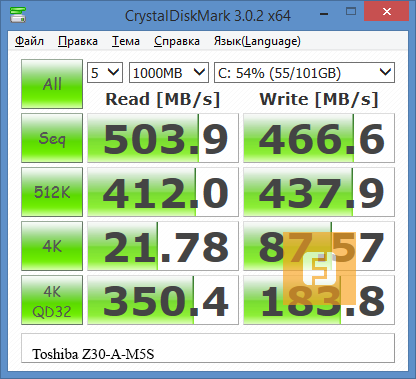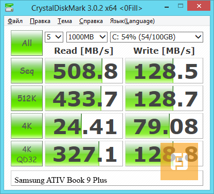 Накопитель отлично проявляет себя в тестах на базе сжимаемых данных, а во всех остальных дисциплинах демонстрирует среднестатистическую производительность. В комплексном подтесте Creative из финского бенчмарка PCMark 8 берёт верх Samsung ATIV Book 9 Plus, скорее всего из-за двухканального режима работы памяти.