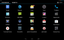 Главное меню — матричного типа с вкладкой виджетов. Меню настроек: вертикальный список опций в левом столбце, доступные параметры — в правом.