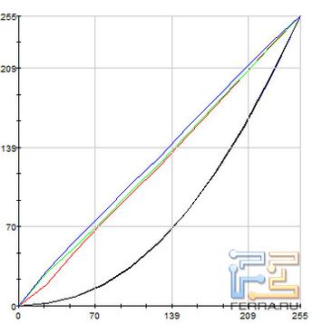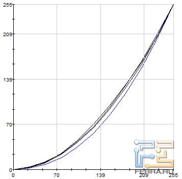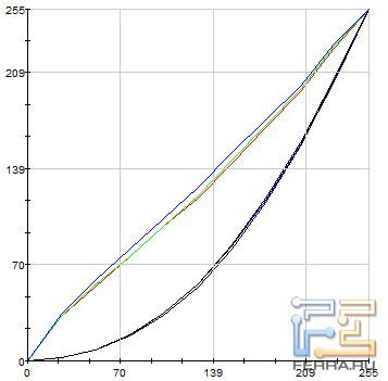 На иллюстрациях, приведённых ниже, отображены гамма-кривые (чёрные графики), полученные до и после калибровки дисплея, целевая гамма 2,2 (светло-синий график) и коррекция для каждого цвета (красный, синий, зелёный).