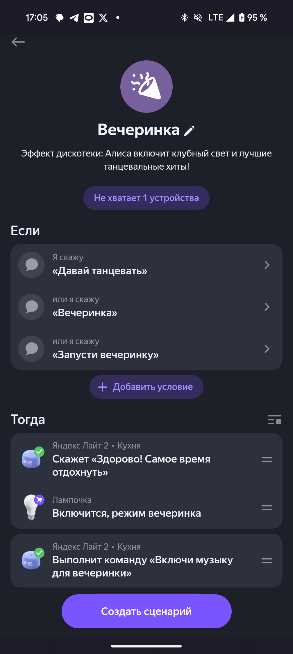 Во-вторых, Яндекс сразу пишет какие устройства нужны для каждого из сценариев и это ЕЩЁ больше упрощает процесс «вкатывания» в экосистему. Да, компания конечно не будет против продать вам ещё пару-тройку датчиков и светодиодных лент, но удобно ведь!