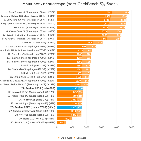 Сейчас SMIC, если мы говорим о смартфонах и планшетах, остался полигоном, в основном, для процессоров уровня "хуже уже особо некуда" — например, процессоров Unisoc серии SC. Такие сегодня встречаются в смартфонах itel, BQ, Inoi, Alcatel... ну, вы поняли. И в старших наиболее дешёвых (до 10 тысяч рублей) смартфонах более породистых брендов — Samsung Galaxy A03 Core, Realme C11 2021, ZTE Blade A71. Это процессоры уровня довольно стареньких уже Snapdragon 625/Snapdragon 460/MediaTek Helio P25, только при этом более прожорливые и склонные к нагреву, ведь техпроцесс у них старый — 28 нм против 14 или 16 нм у остальных процессоров с такой конструкцией.