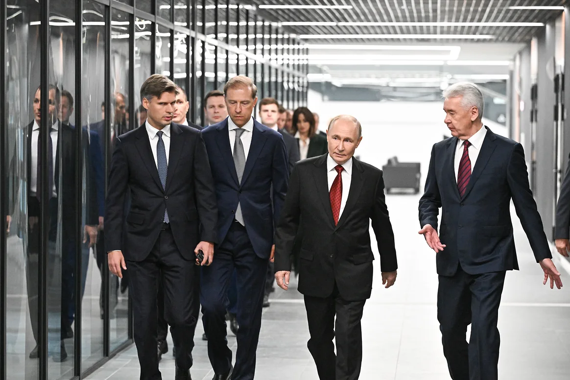 Глава «Роскосмоса» Дмитрий Баканов, первый вице-премьер Денис Мантуров, президент России Владимир Путин и мэр Москвы Сергей Собянин во время открытия Национального космического центра