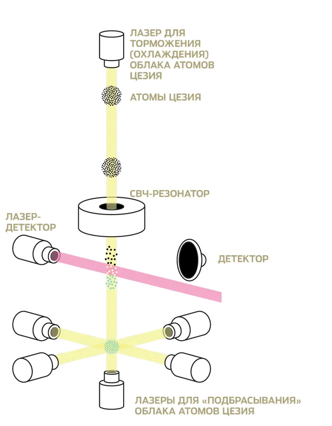 И работают они довольно забавно (ну для вещей, которые связаны с ядерной физикой): охлаждённые атомы цезия подбрасываются вверх на двухметровую высоту, как в настоящем водяном фонтане. Там они регистрируются, а затем снова летят вниз.