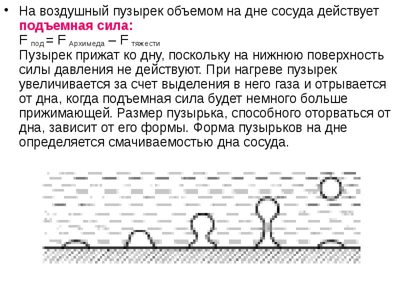 При нагреве пузырек увеличивается за счёт выделения в него газа и отрывается от дна, когда подъёмная сила будет немного больше прижимающей