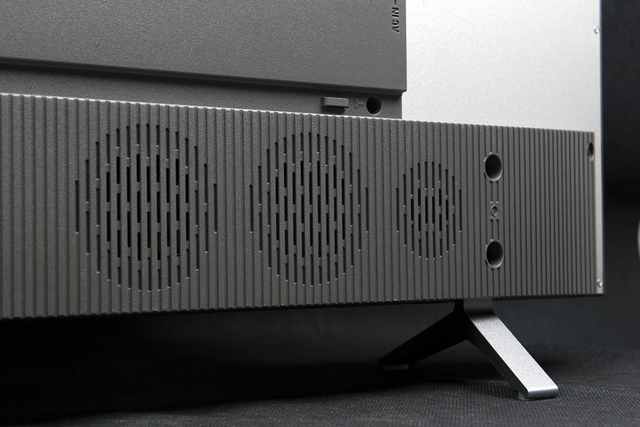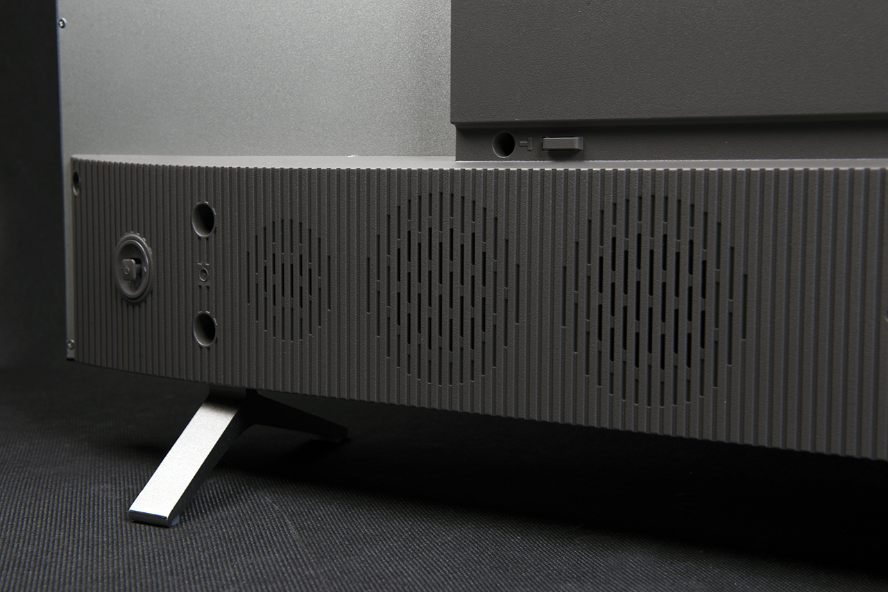 TCL L50C1US приятен внешне. У телевизора довольно тонкие рамки и миниатюрные ножки. В итоге 25-килограммовый «ящик» кажется очень легким. Есть и своеобразная дизайнерская «фишка»: по бокам используется серебряная окантовка, сверху и снизу — черная. Вообще матрица крпеится в металлическом корпусе. А вот управляющая логика, питание и динамики помещены в пластиковые отсеки. В итоге толщина TCL L50C1US составляет 59 мм, хотя сам экран не толще смартфона.