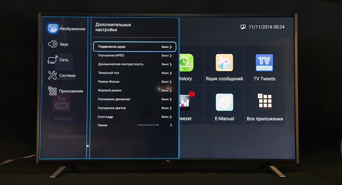 Настроек качества изображения не очень много. Из заготовленных пресетов есть режимы «Кино», «Стандарт», «Динамический», «Натуральный» и «Персональный». Тестирование проводилось в первом. Настроек качества несколько: мы можем регулировать гамму и баланс белого.