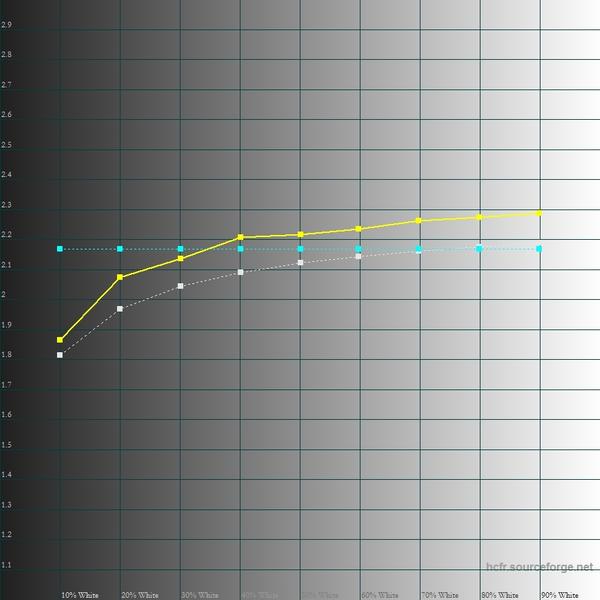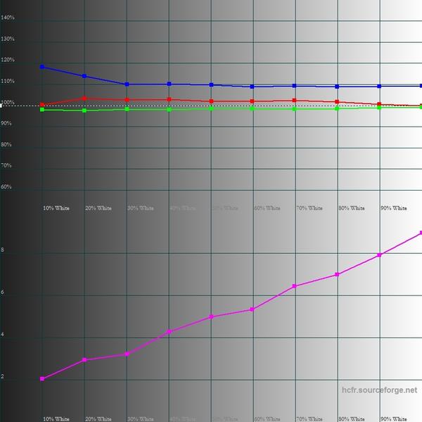 Этих настроек хватило, чтобы подтянуть качество TCL L50C1US на должный уровень. Из коробки, в режиме «Кино», телевизор демонстрирует средние показатели. Так, колориметр замерил довольно низкую гамму — 2. Цветовая температура при этом держится в районе 9000К. Ошибка в тесте ColorCheker с 24 паттернами тоже большая — 9. Результаты на «троечку», не больше. К счастью, небольшая калибровка TCL L50C1US исправляет большинство огрехов. В том же режиме «Кино» я получил следующие результаты: отклонения Delta-E по шкале серого и по 24 цветам — 4 и 3,5 соответственно; гамма — 2,17; цветовая температура — ~7000К. Не идеально, но уже хорошо.