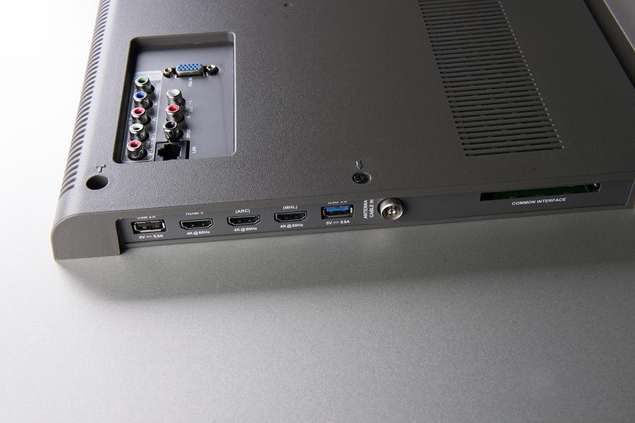 Блок питания — встроенный. Интерфейсы разведены на два отсека. На торце логично расположились три порта HDMI. Все поддерживают подключение источника с разрешением 4K и частотой 60 Гц. Там же распаяно два USB-порта. Один второй ревизии с током 0,5 А, второй — третьей версии и 0,9 А соответственно. Внешние жесткие диски определяются и работают без каких-либо проблем. Чуть забегая вперед: телевизор умеет записывать видеопоток на USB-носитель.