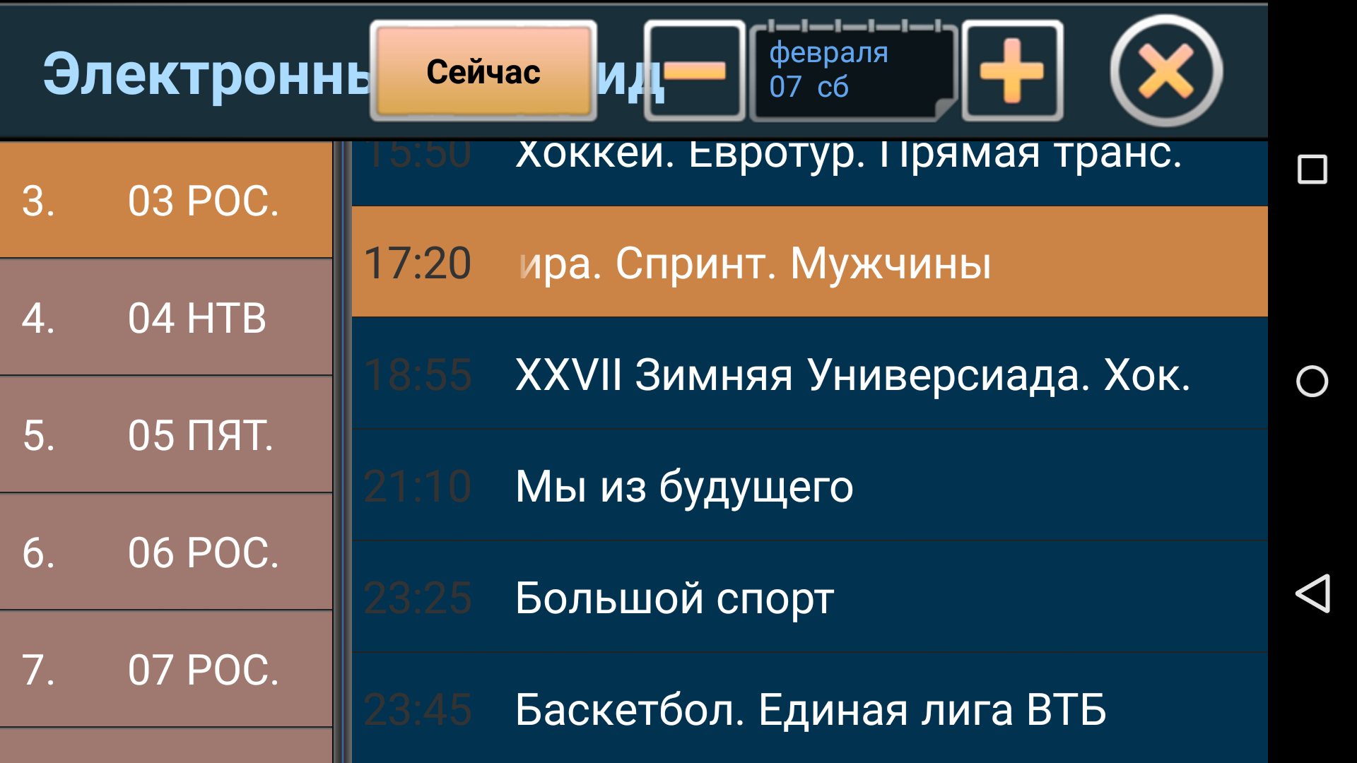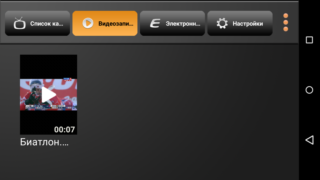 Меню программы состоит из четырех вкладок: «Воспроизведение», «Видеозаписи», «Электронный гид» и «Настройки». В первой закладке расположены непосредственно найденные телеканалы и радиостанции.