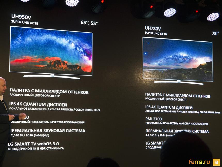 Топовые IPS-телевизоры тоже придерживаются типоразмеров 55 и 65 дюймов. Исключения составляют модель UH955V диагональю 86 дюймов и UH780V диагональю 75 дюймов. А так серия UH950V — это 55 и 65 дюймов. Линейка UH750V — это 55, 49 и 43 дюйма соответственно. Есть еще 4K-серии UH671V, UH651V, UH630V, UH620V и UH619V/UH610V. Все — с поддержкой HDR. Как видите, список внушительный. Ставка на Ultra HD сделана. Ставок больше нет. Далее среди новинок идут Full HD-модели. Телевизоров с ЖК-технологией и изогнутым экранами не презентовано вообще.