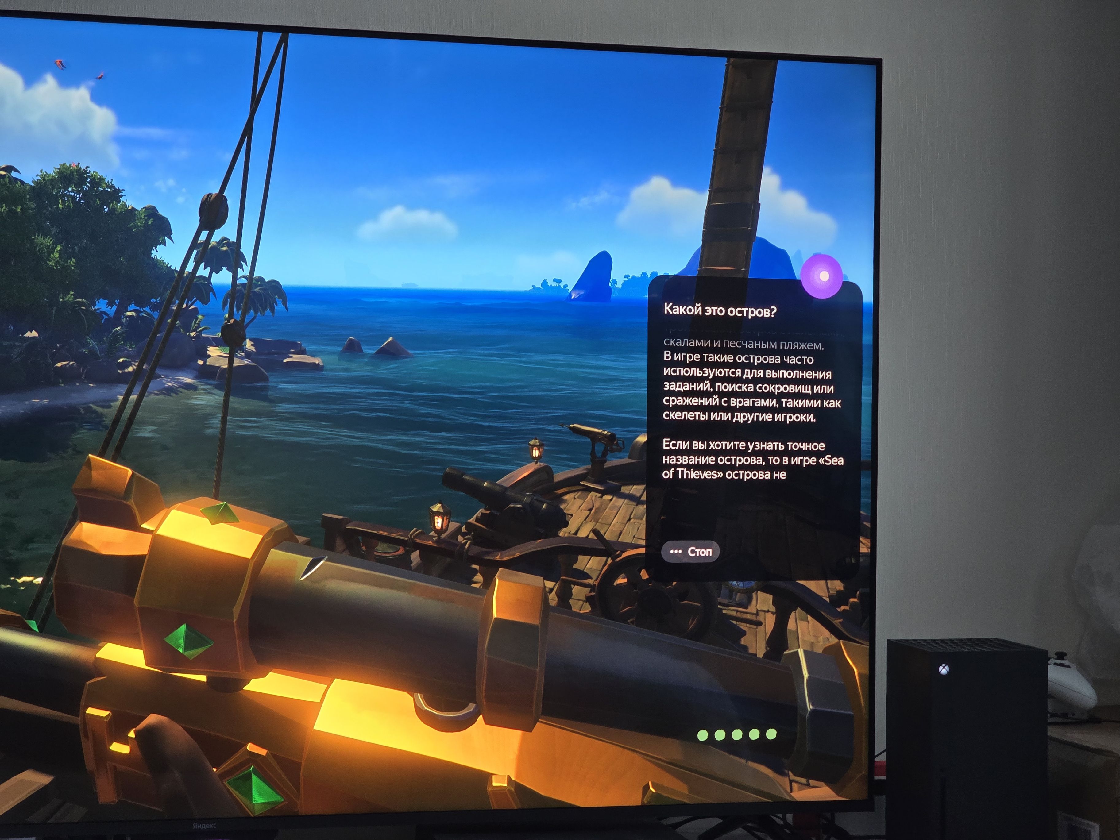 Ну, с фильмом понятно — там ничего сложного. А вот с играми Алиса пока частенько тупит или (как и многие современные ИИ) выдаёт неверные ответы. Например, я играл в Sea Of Thieves на своём Xbox Series X: это такая игра, где ты — пират и плаваешь на своём корабле по огромному морю, сражаясь или кооперируясь с другими игроками-пиратами. И вот остановившись у одного острова спросил: «Алиса, какой это остров?».
